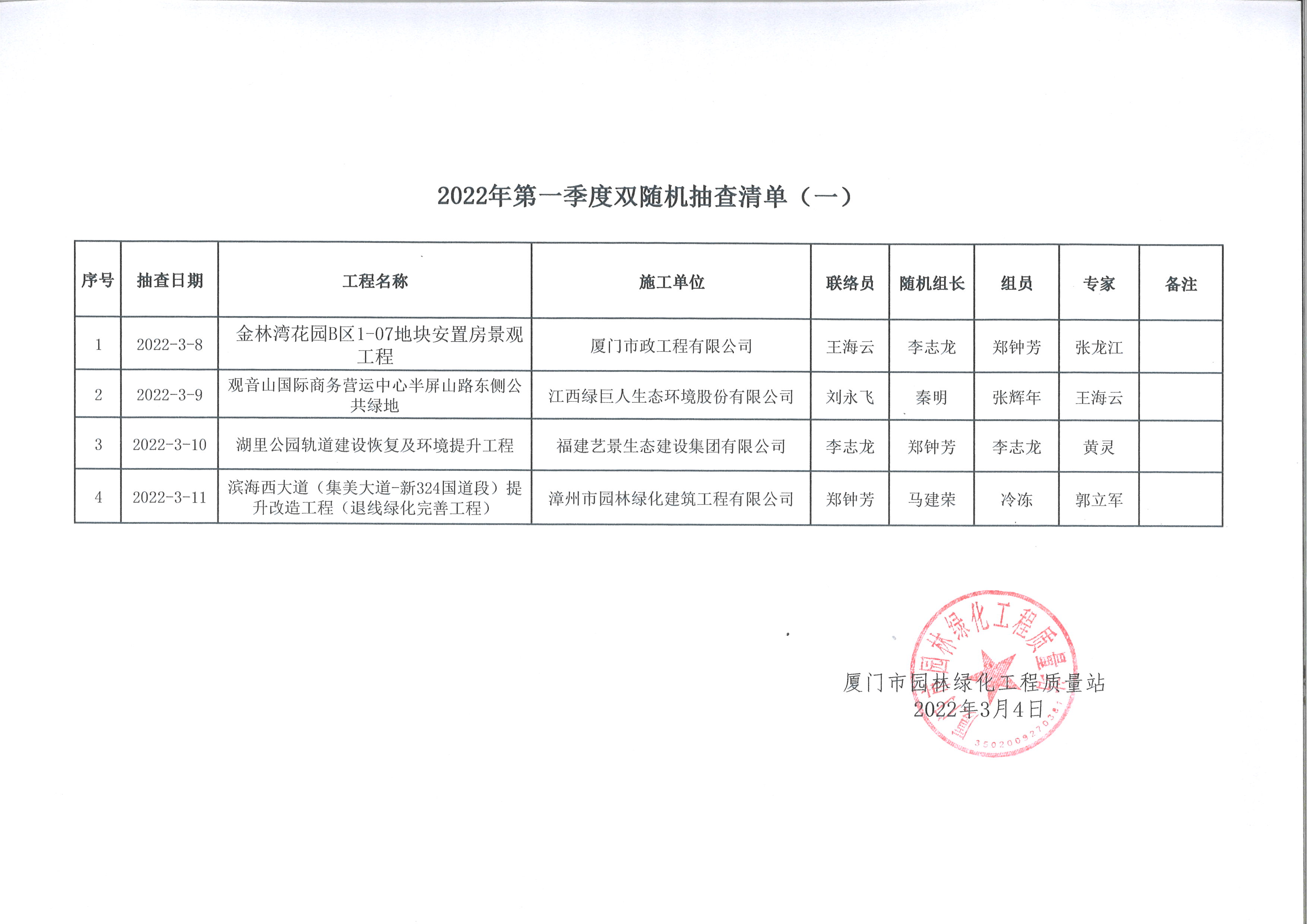 2022年第一季度双随机抽查清单(一)